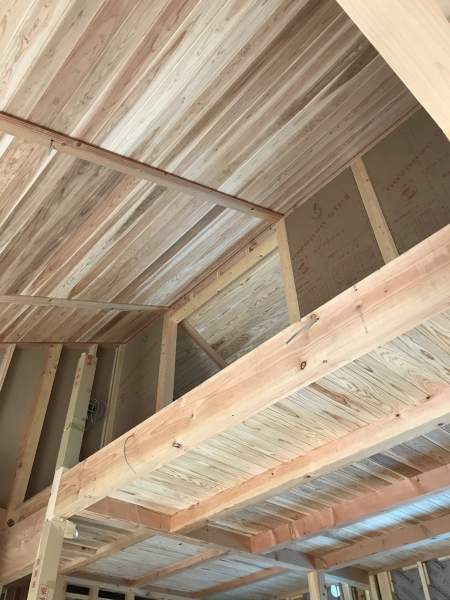 現場では天井を張り終え、床にフローリングを張る作業が進んでいます。