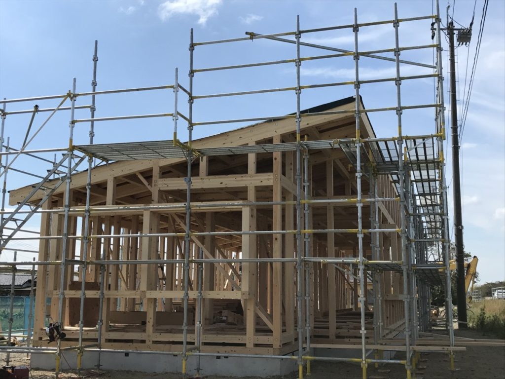 外張り断熱 新築住宅の家の外部に断熱材を張り終えました。