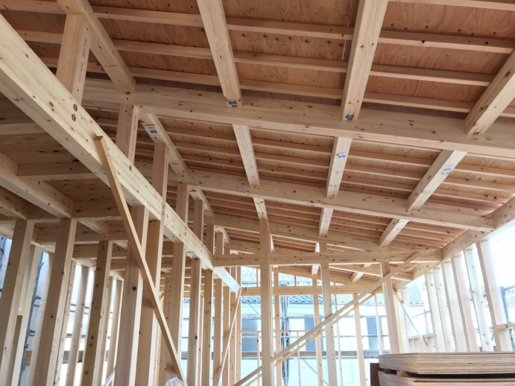 二階の骨組みです。完成すると壁で隠れてしまいますが、頑丈な家づくりの要になる大切な部分です。