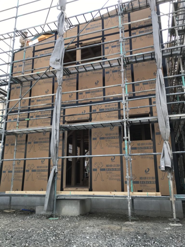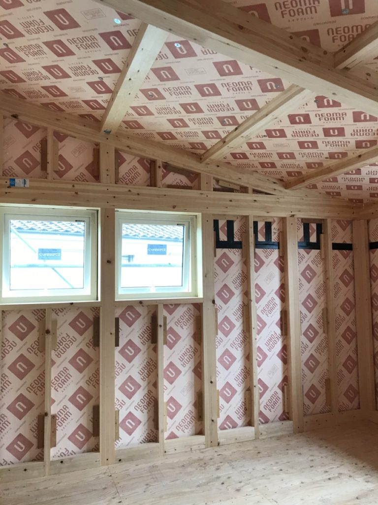 こちらの住宅は付加断熱工法(充填断熱と外張り断熱を両方します)で施工しています。