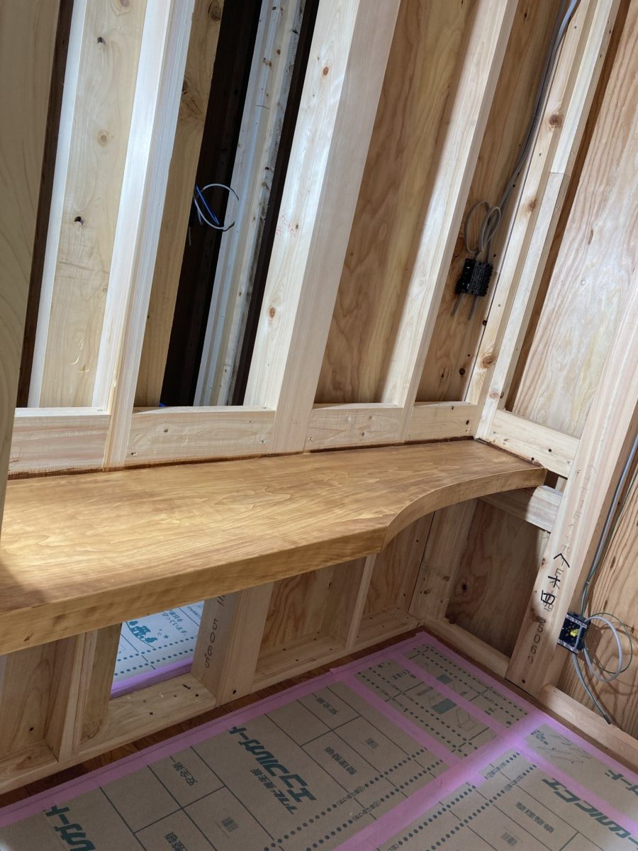 お手洗いのカウンターが設置されています。ヒノキの一枚板を使用しました。