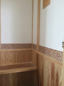 新築住宅の現場では、作業が着々と進んでいます。 部屋の壁に漆喰を塗る作業が終わりました。 お手洗いの壁面は腰壁を張り、モザイクタイルでアクセントをつけました。 心地よい空間に仕上がりました。