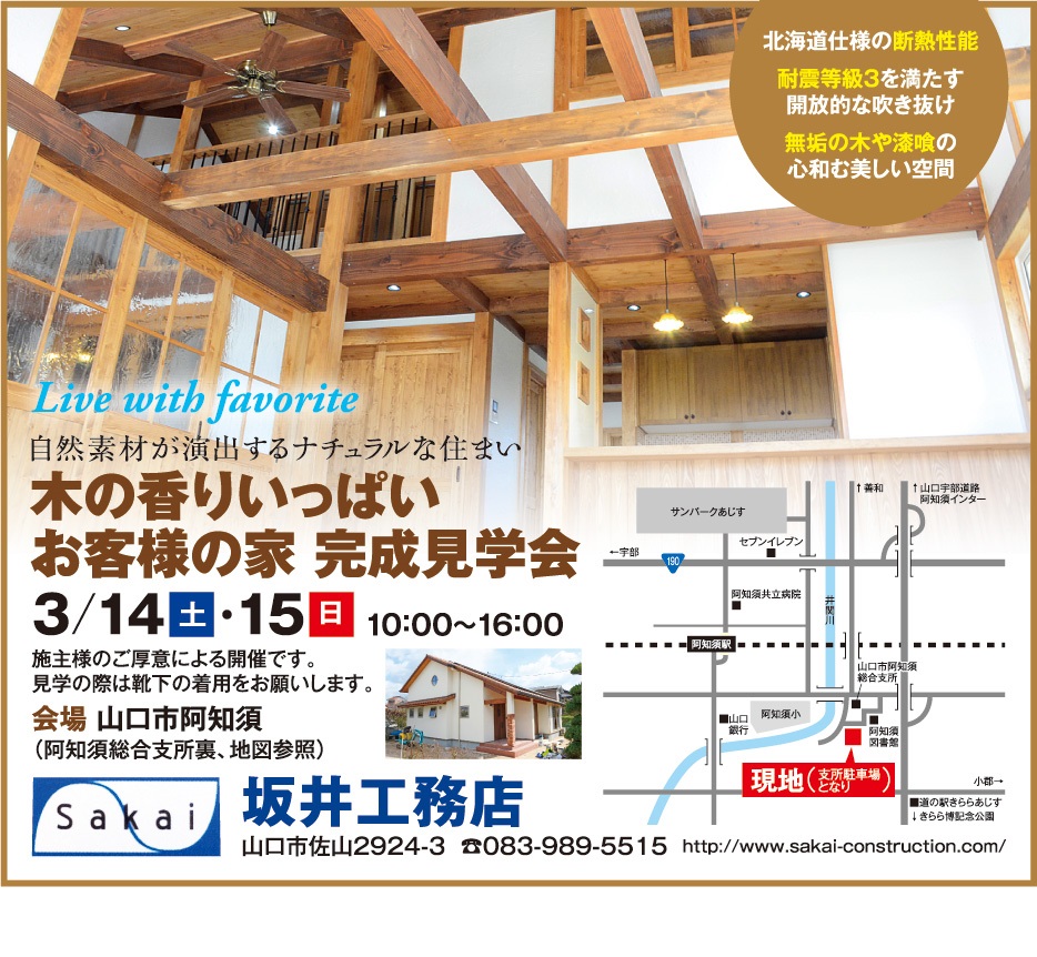 木の香りいっぱいお客様の家 完成見学会 2018年2月1日 坂井工務店の最新情報 山口県山口市阿知須にて予約制完成見学会を行います。 建物がほぼ完成し、3月14~15日にてお施主様のご厚意で予約制完成見学会を行います。 山口市の家づくりに関することはお気軽にお問い合わせください。 083-989-5515 平日 9:00 - 17:00 お問い合わせ メールは24時間受け付けております。 前後の記事 前の記事 ショールームへ 次の記事 どの部屋からも家族を感じる家